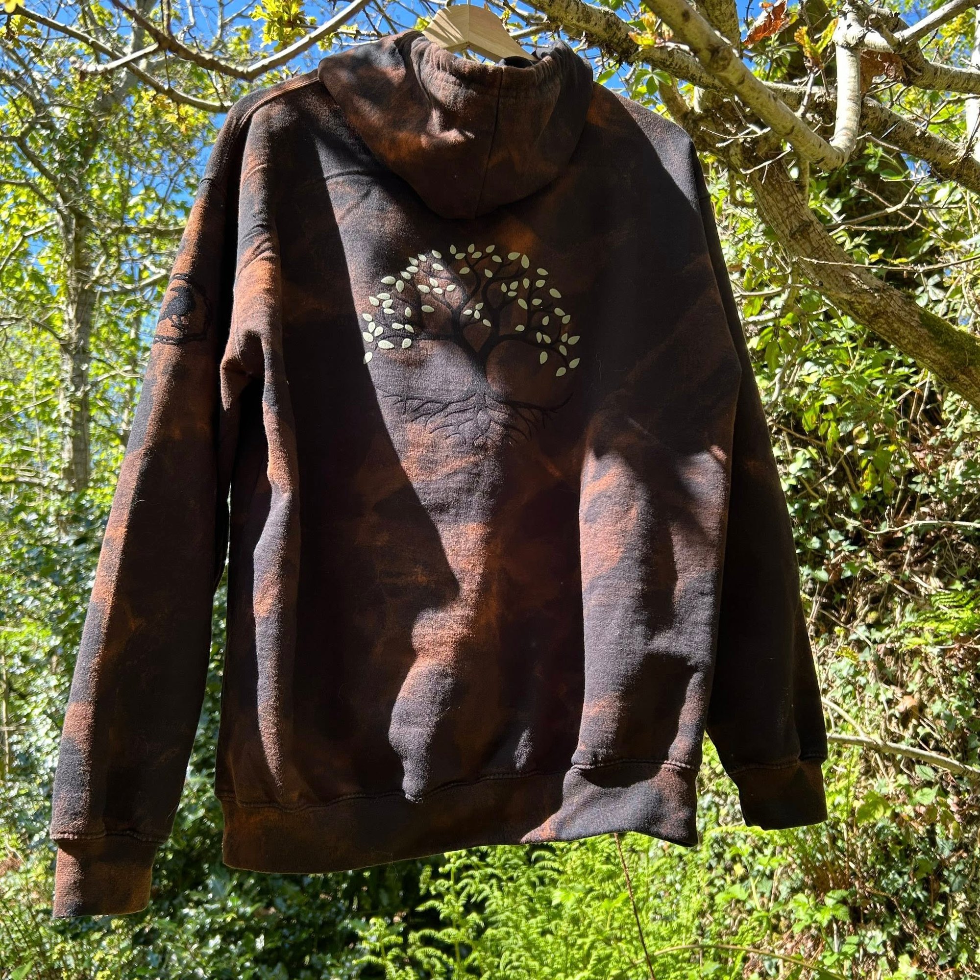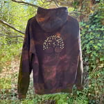 - Hand bleached/reverse dye hoodie with flock motif on front and rear with Blackthorn & Crow logo on the sleeve.